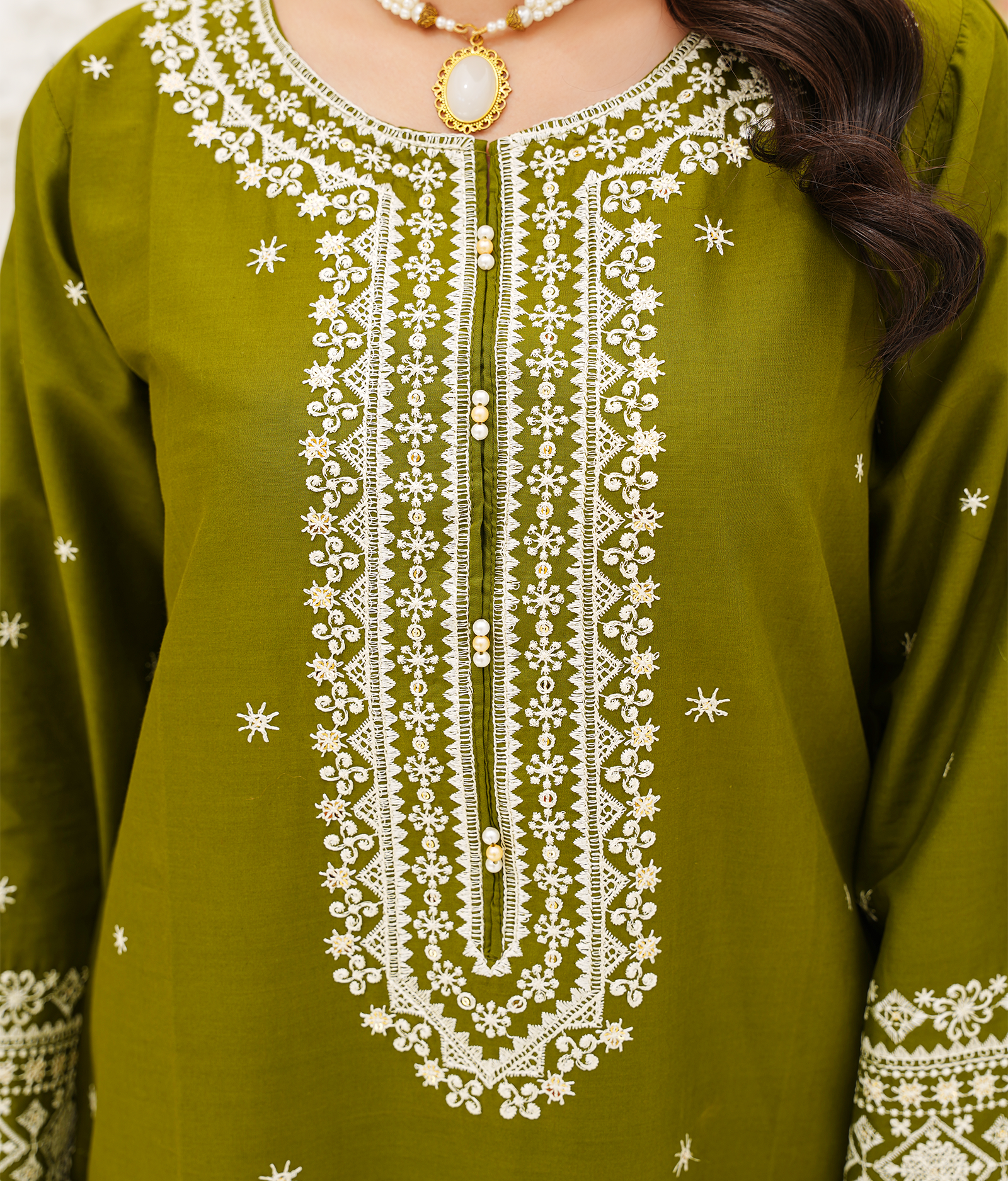 embroidered cotton set. Featuring a long kurta with delicate embroidery and straight trousers, this 2-piece offers the perfect mix of comfort and poise. Designed for effortless daily wear, it’s a versatile choice that keeps you looking polished all day.